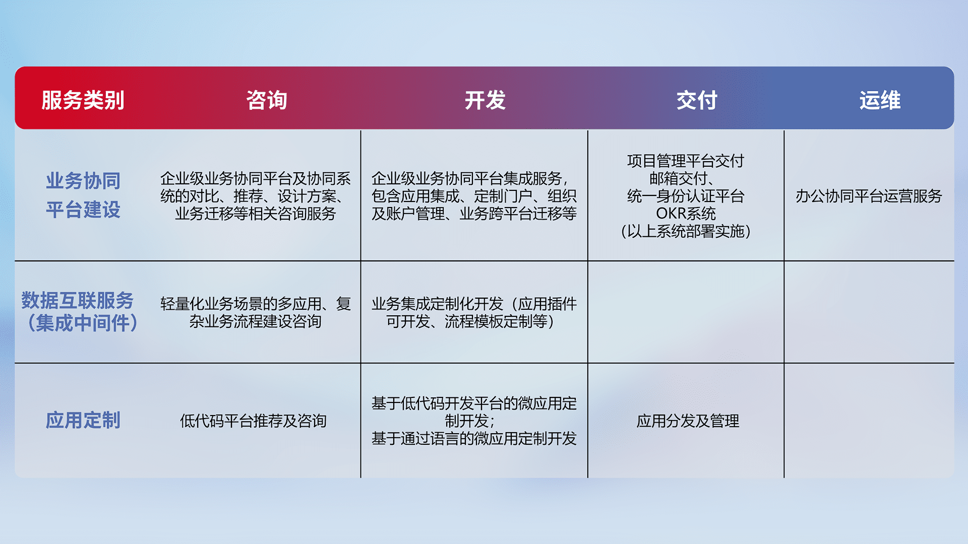 针对钉钉、、、企微、、、IDaas等平台级产品提供产品的规划、、、方案、、交付、、、定制化开发等服务,,,,实现如统一协同办公、、、智能客户服务、、混合会议管理、、智能数据查询、、、、等业务场景,,,,实现数字化转型。。