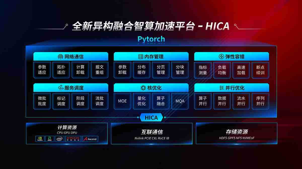 通过自研的服务层、、中间适配层、、、、以及调度编排算法,,,采用数据并行、、模型并行等多种并行方式,,,,把并行计算任务进行有效的分解,,,使其分别由相应的软件栈和算力资源来承接。。当GPU资源变化,,HICA可以实时动态调度计算子任务并调整模型拓扑和架构,,,以充分聚合各种算力资源。。。